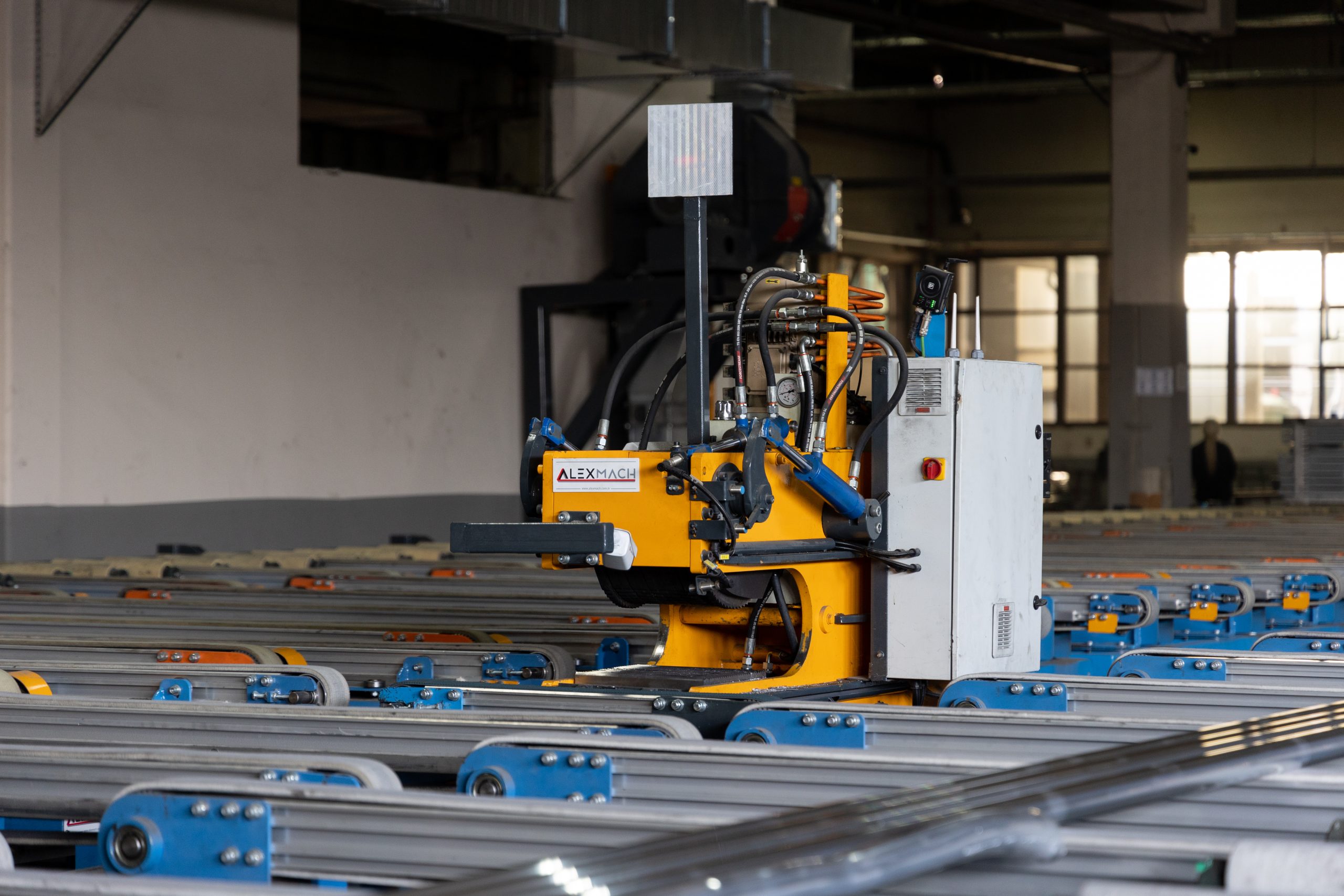 The stretching jaws are specially designed to prevent damage to the profile during operation. Additional conveyor arms are positioned in front of the stretching units.